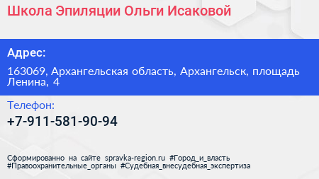 Школа Эпиляции Ольги Исаковой по адресу 163069, Архангельская область, Архангельск, площадь Ленина, 4 в дальнейшем Организация, размещена в следующих категориях: