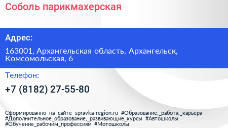 Соболь, парикмахерская по адресу 163001, Архангельская область, Архангельск, Комсомольская, 6 в дальнейшем Организация, размещена в следующих категориях: