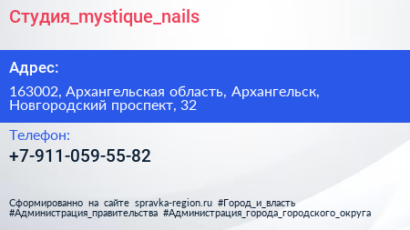 Студия_mystique_nails по адресу 163002, Архангельская область, Архангельск, Новгородский проспект, 32 в дальнейшем Организация, размещена в следующих категориях: