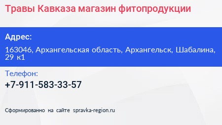 Травы Кавказа, магазин фитопродукции по адресу 163046, Архангельская область, Архангельск, Шабалина, 29 к1 в дальнейшем Организация, размещена в следующих категориях: