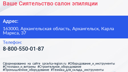 Ваше Сиятельство, салон эпиляции по адресу 163000, Архангельская область, Архангельск, Карла Маркса, 37 в дальнейшем Организация, размещена в следующих категориях: