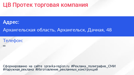 ЦВ Протек, торговая компания по адресу Архангельская область, Архангельск, Дачная, 48 в дальнейшем Организация, размещена в следующих категориях: