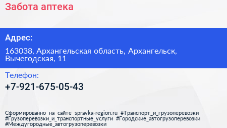 Забота, аптека по адресу 163038, Архангельская область, Архангельск, Вычегодская, 11 в дальнейшем Организация, размещена в следующих категориях: