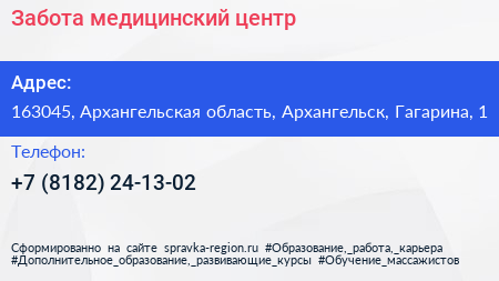 Забота, медицинский центр по адресу 163045, Архангельская область, Архангельск, Гагарина, 1 в дальнейшем Организация, размещена в следующих категориях: