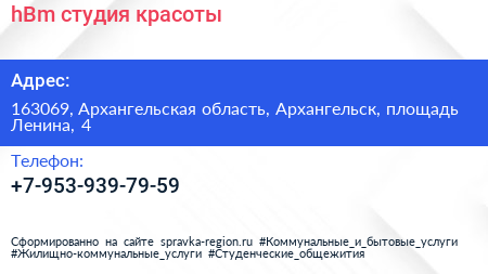 hBm, студия красоты по адресу 163069, Архангельская область, Архангельск, площадь Ленина, 4 в дальнейшем Организация, размещена в следующих категориях: