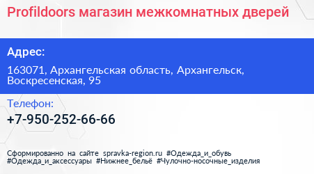 Profildoors, магазин межкомнатных дверей по адресу 163071, Архангельская область, Архангельск, Воскресенская, 95 в дальнейшем Организация, размещена в следующих категориях: