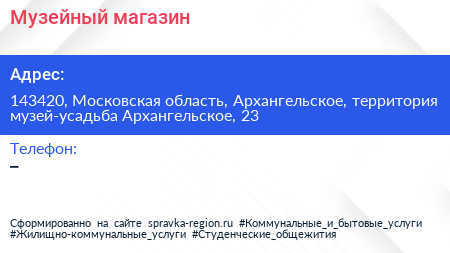 Музейный магазин по адресу 143420, Московская область, Архангельское, территория музей-усадьба Архангельское, 23 в дальнейшем Организация, размещена в следующих категориях: