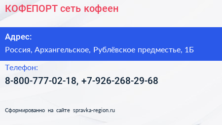 КОФЕПОРТ, сеть кофеен по адресу 1Б, Рублевское предместье, Жилой комплекс «Рублёвское предместье», Глухово, городской округ Красногорск, Московская область, Центральный федеральный округ, 143421, Россия в дальнейшем Организация, размещена в следующих категориях: