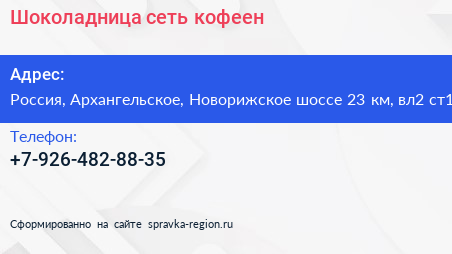 Шоколадница, сеть кофеен по адресу VIPКовёр, 2, Ольховая улица, КП «Новоархангельское», Красногорск, городской округ Красногорск, Московская область, Центральный федеральный округ, 143444, Россия в дальнейшем Организация, размещена в следующих категориях: