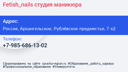 Fetish_nails, студия маникюра по адресу 7 к2, улица Рублёвское предместье, Жилой комплекс «Рублёвское предместье», Глухово, городской округ Красногорск, Московская область, Центральный федеральный округ, 143421, Россия в дальнейшем Организация, размещена в следующих категориях: