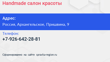 Handmade, салон красоты по адресу 9, улица Пришвина, Жилой комплекс «Опалиха 03», Опалиха, Красногорск, городской округ Красногорск, Московская область, Центральный федеральный округ, 143405, Россия в дальнейшем Организация, размещена в следующих категориях: