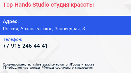 Top Hands Studio, студия красоты по адресу Top Hands Studio, 3, Заповедная улица, Жилой комплекс «Ильинские луга», Ильинское-Усово, городской округ Красногорск, Московская область, Центральный федеральный округ, 143421, Россия в дальнейшем Организация, размещена в следующих категориях: