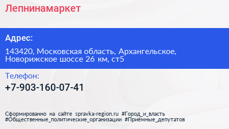 Лепнинамаркет по адресу 143420, Московская область, Архангельское, Новорижское шоссе 26 км, ст5 в дальнейшем Организация, размещена в следующих категориях: