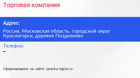 Торговая компания по адресу Россия, Московская область, городской округ Красногорск, деревня Поздняково в дальнейшем Организация, размещена в следующих категориях: