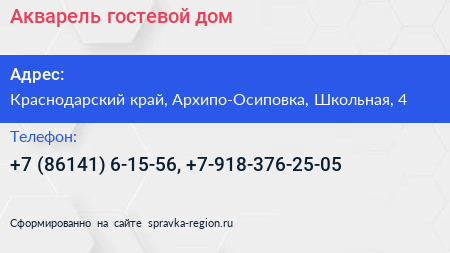 Акварель, гостевой дом по адресу Краснодарский край, Архипо-Осиповка, Школьная, 4 в дальнейшем Организация, размещена в следующих категориях: