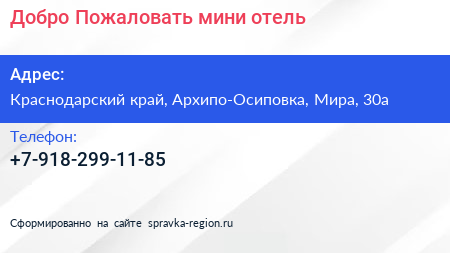 Добро Пожаловать, мини-отель по адресу Краснодарский край, Архипо-Осиповка, Мира, 30а в дальнейшем Организация, размещена в следующих категориях:
