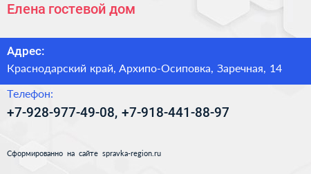 Елена, гостевой дом по адресу Краснодарский край, Архипо-Осиповка, Заречная, 14 в дальнейшем Организация, размещена в следующих категориях: