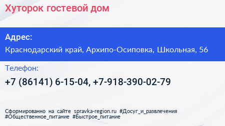 Хуторок, гостевой дом по адресу Краснодарский край, Архипо-Осиповка, Школьная, 56 в дальнейшем Организация, размещена в следующих категориях:
