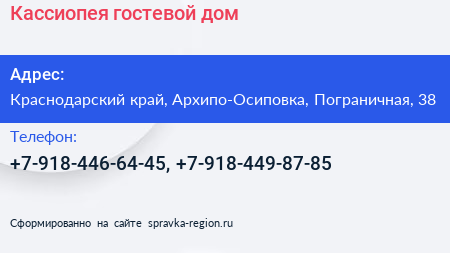 Кассиопея, гостевой дом по адресу Краснодарский край, Архипо-Осиповка, Пограничная, 38 в дальнейшем Организация, размещена в следующих категориях: