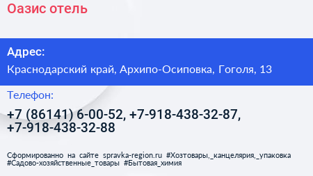 Оазис, отель по адресу Краснодарский край, Архипо-Осиповка, Гоголя, 13 в дальнейшем Организация, размещена в следующих категориях: