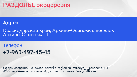 РАЗДОЛЬЕ, экодеревня по адресу Краснодарский край, Архипо-Осиповка, посёлок Архипо-Осиповка, 1 в дальнейшем Организация, размещена в следующих категориях: