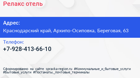 Релакс, отель по адресу Краснодарский край, Архипо-Осиповка, Береговая, 63 в дальнейшем Организация, размещена в следующих категориях:
