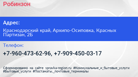Робинзон по адресу Краснодарский край, Архипо-Осиповка, Красных Партизан, 2Б в дальнейшем Организация, размещена в следующих категориях: