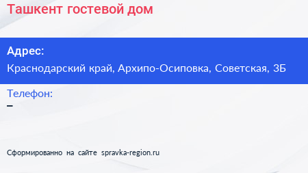 Ташкент, гостевой дом по адресу Краснодарский край, Архипо-Осиповка, Советская, 3Б в дальнейшем Организация, размещена в следующих категориях: