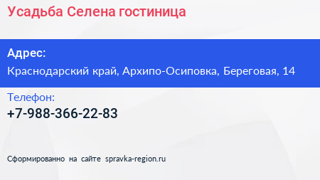 Усадьба Селена, гостиница по адресу Краснодарский край, Архипо-Осиповка, Береговая, 14 в дальнейшем Организация, размещена в следующих категориях: