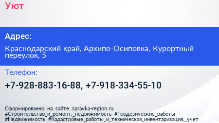 Уют по адресу Краснодарский край, Архипо-Осиповка, Курортный переулок, 5 в дальнейшем Организация, размещена в следующих категориях: