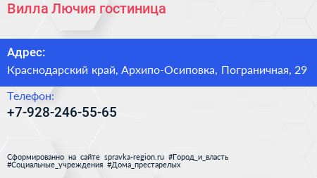 Вилла Лючия, гостиница по адресу Краснодарский край, Архипо-Осиповка, Пограничная, 29 в дальнейшем Организация, размещена в следующих категориях: