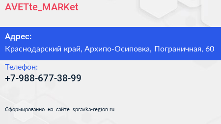 AVETte_MARKet по адресу Краснодарский край, Архипо-Осиповка, Пограничная, 60 в дальнейшем Организация, размещена в следующих категориях: