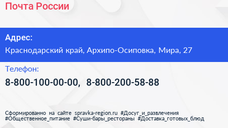 Почта России по адресу Краснодарский край, Архипо-Осиповка, Мира, 27 в дальнейшем Организация, размещена в следующих категориях: