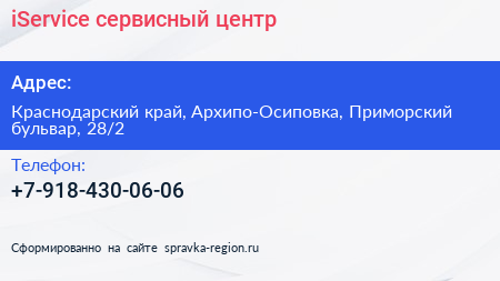 iService, сервисный центр по адресу Краснодарский край, Архипо-Осиповка, Приморский бульвар, 28/2 в дальнейшем Организация, размещена в следующих категориях:
