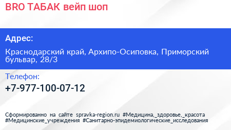 BRO ТАБАК, вейп-шоп по адресу Краснодарский край, Архипо-Осиповка, Приморский бульвар, 28/3 в дальнейшем Организация, размещена в следующих категориях: