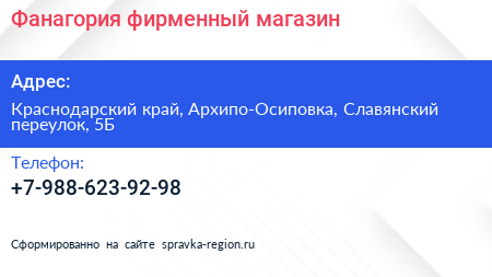 Фанагория, фирменный магазин по адресу Краснодарский край, Архипо-Осиповка, Славянский переулок, 5Б в дальнейшем Организация, размещена в следующих категориях: