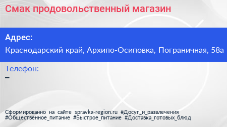Смак, продовольственный магазин по адресу Краснодарский край, Архипо-Осиповка, Пограничная, 58а в дальнейшем Организация, размещена в следующих категориях: