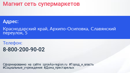 Магнит, сеть супермаркетов по адресу Краснодарский край, Архипо-Осиповка, Славянский переулок, 5 в дальнейшем Организация, размещена в следующих категориях: