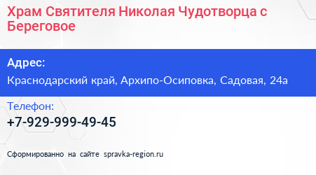 Храм Святителя Николая Чудотворца, с. Береговое по адресу Краснодарский край, Архипо-Осиповка, Садовая, 24а в дальнейшем Организация, размещена в следующих категориях: