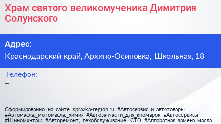 Храм святого великомученика Димитрия Солунского по адресу Краснодарский край, Архипо-Осиповка, Школьная, 18 в дальнейшем Организация, размещена в следующих категориях: