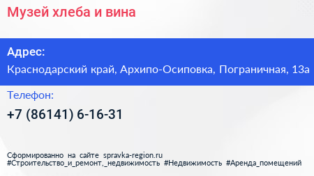 Музей хлеба и вина по адресу Краснодарский край, Архипо-Осиповка, Пограничная, 13а в дальнейшем Организация, размещена в следующих категориях: