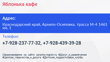 Яблонька, кафе по адресу Краснодарский край, Архипо-Осиповка, трасса М-4 1461 км, 1 в дальнейшем Организация, размещена в следующих категориях: