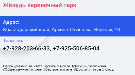 Жёлудь, веревочный парк по адресу Краснодарский край, Архипо-Осиповка, Верхняя, 10 в дальнейшем Организация, размещена в следующих категориях:
