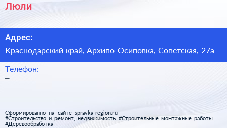 Люли по адресу Краснодарский край, Архипо-Осиповка, Советская, 27а в дальнейшем Организация, размещена в следующих категориях: