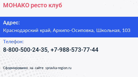 МОНАКО, ресто-клуб по адресу Краснодарский край, Архипо-Осиповка, Школьная, 103 в дальнейшем Организация, размещена в следующих категориях:
