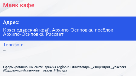 Маяк, кафе по адресу Краснодарский край, Архипо-Осиповка, посёлок Архипо-Осиповка, Рассвет в дальнейшем Организация, размещена в следующих категориях: