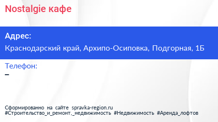Nostalgie, кафе по адресу Краснодарский край, Архипо-Осиповка, Подгорная, 1Б в дальнейшем Организация, размещена в следующих категориях: