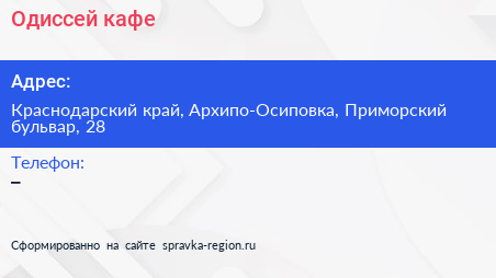 Одиссей, кафе по адресу Краснодарский край, Архипо-Осиповка, Приморский бульвар, 28 в дальнейшем Организация, размещена в следующих категориях:
