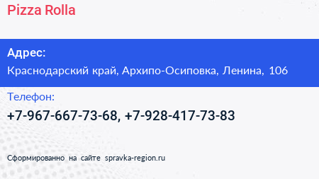 Pizza Rolla по адресу Краснодарский край, Архипо-Осиповка, Ленина, 106 в дальнейшем Организация, размещена в следующих категориях: