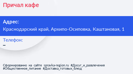 Причал, кафе по адресу Краснодарский край, Архипо-Осиповка, Каштановая, 1 в дальнейшем Организация, размещена в следующих категориях: